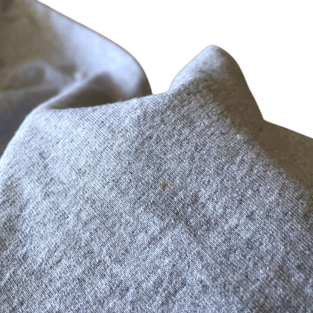 状態:前面と右袖にシミ、裾ステッチ上にダメージあり。