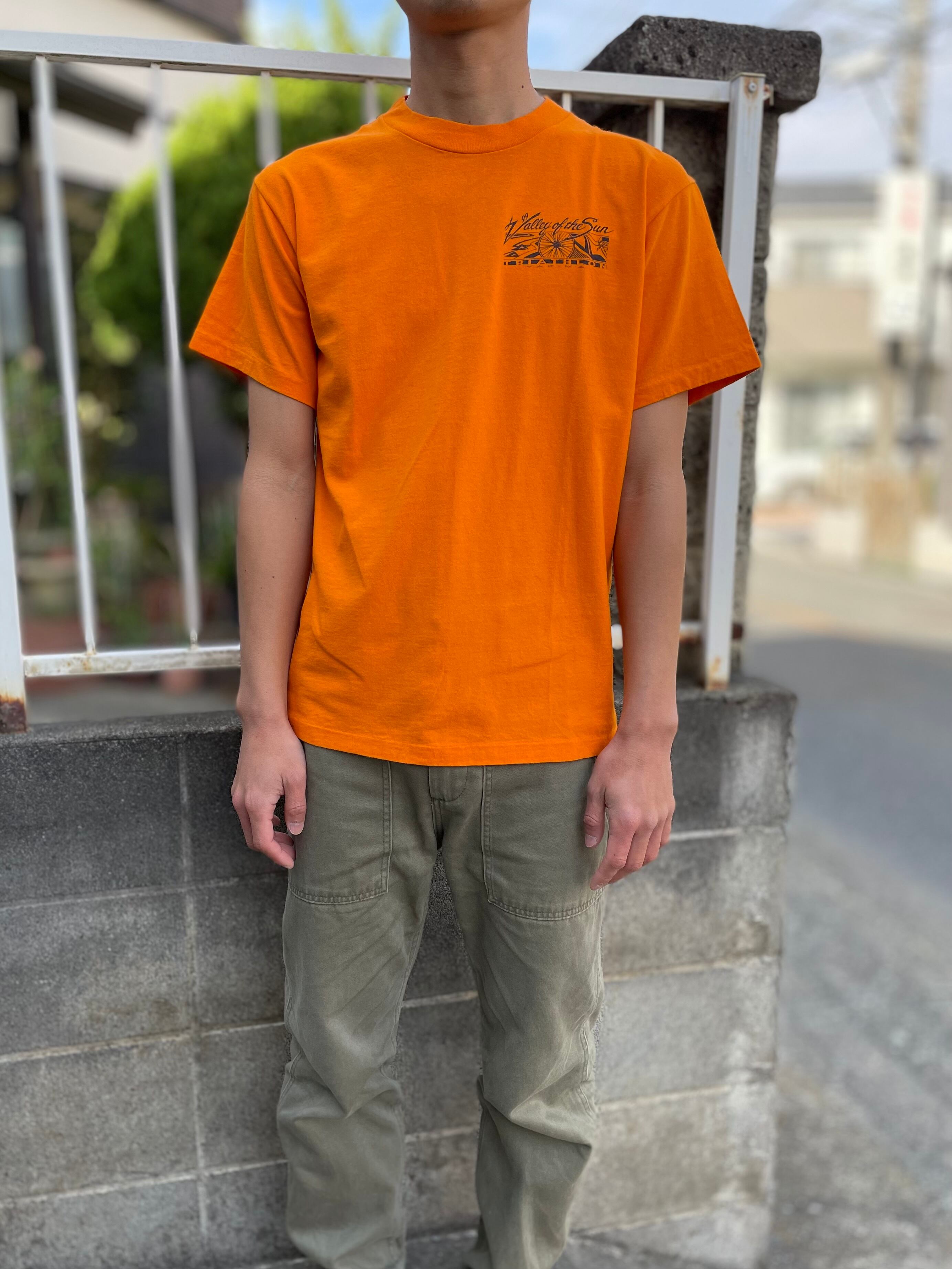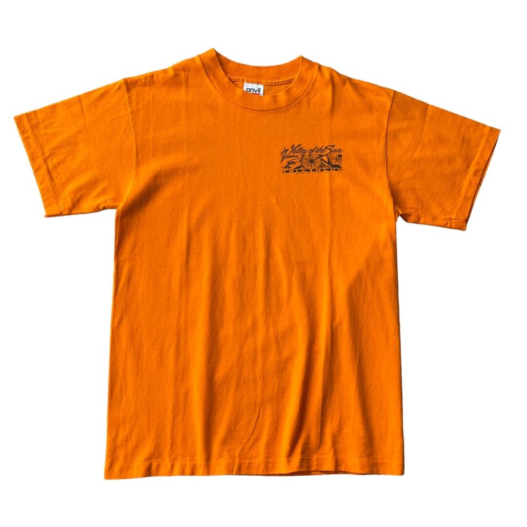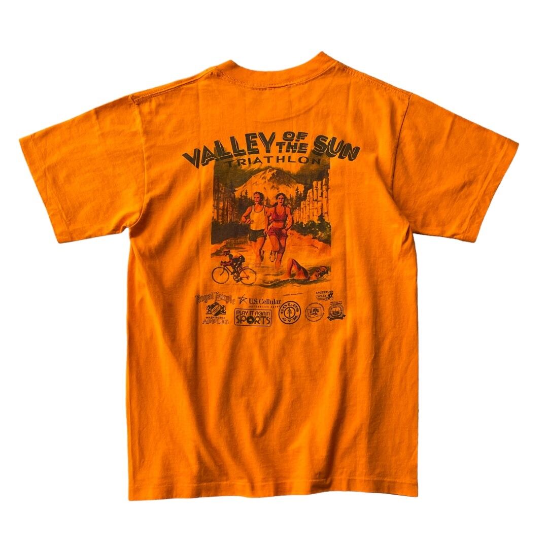 90s anvil S/S cotton printed T-shirt "USA" / アンビル 染み込みプリント Tシャツ M 半袖 オレンジ トライアスロン