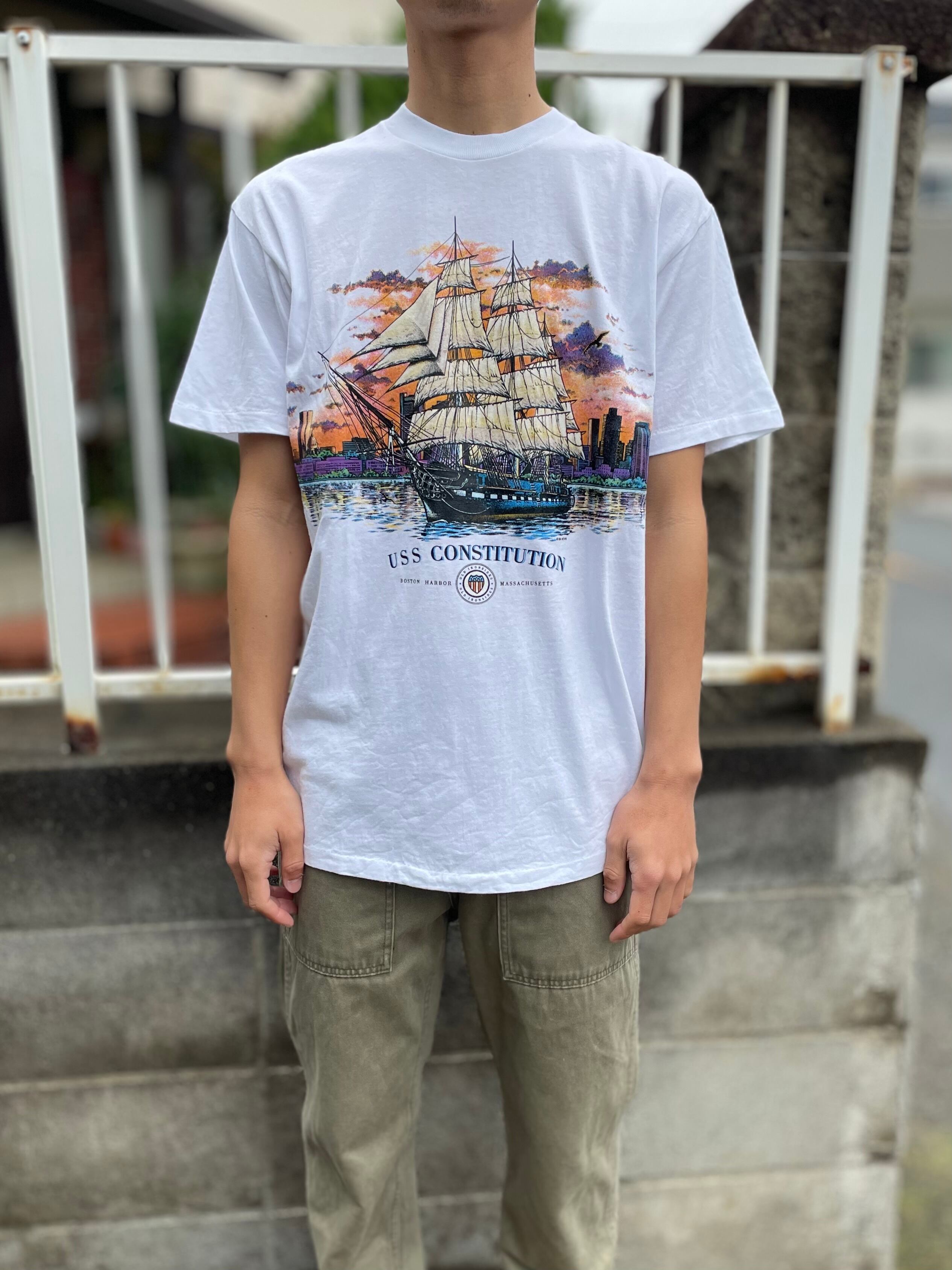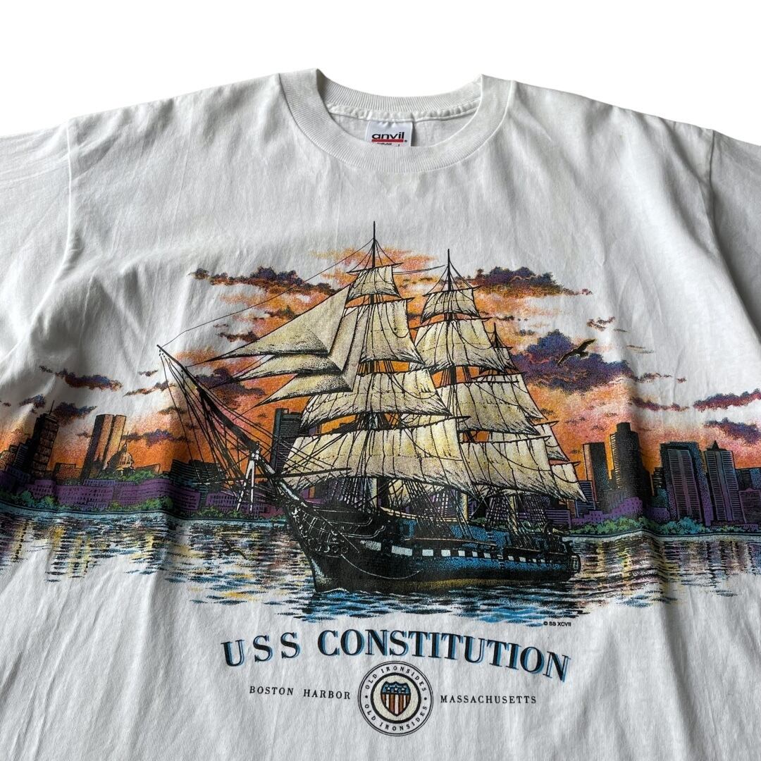 90s~ anvil S/S cotton printed T-shirt L "USA" / アンビル ボストン港 風景 プリント Tシャツ USA製